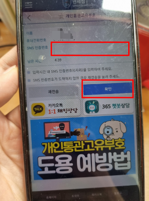 6. 핸드폰으로 온 인증번호를 입력하고, 밑에 확인을 선택합니다.