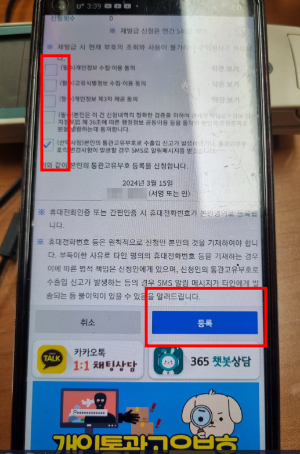 3. 정보 수집 동의에 선택하고, 하단의 등록을 선택하면 수정사항 변경 및 재등록 신청이 완료됩니다.