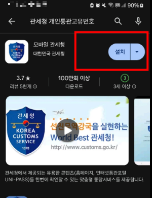1. 핸드폰 구글 플레이 앱에서 "관세청 개인통관고유번호(부호)"를 조회 후 설치버튼을 선택합니다.