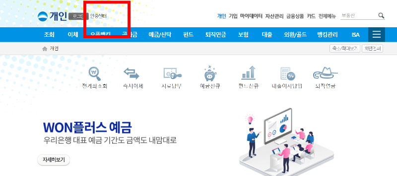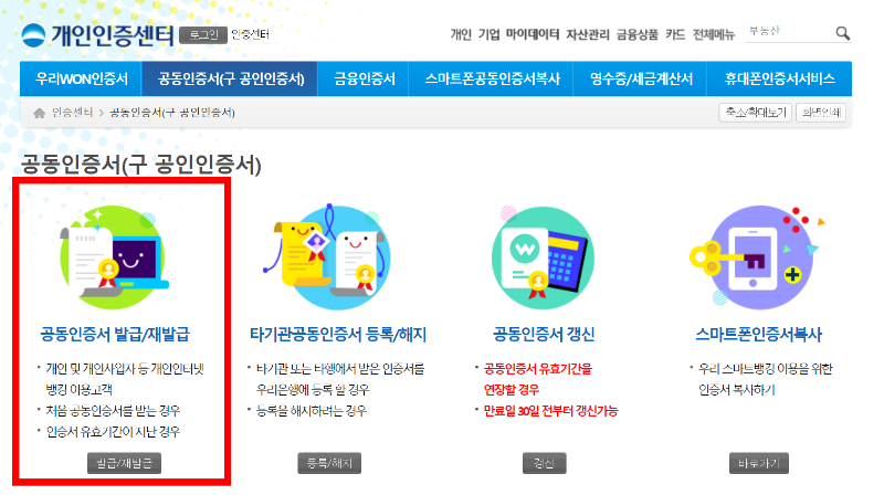 1. 우리은행 개인인터넷 뱅킹에 접속- 인증센터- 개인 선택