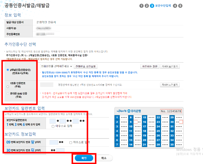 7. 추가 인증 수단을 선택하셔서 2차 인증을 받으시고, 보안카드 이용하시는 경우 해당 번호를 입력, OTP카드를 이용하시는 경우 해당 번호를 입력하시고 확인을 누르시면 됩니다.