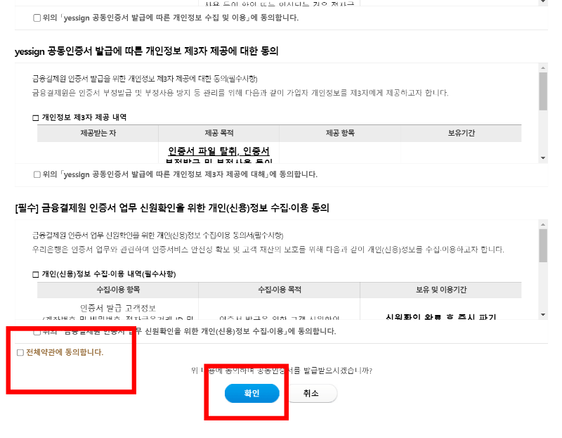 5. 화면을 아래로 내리신 후에 전체약관에 동의, 확인을 선택합니다.