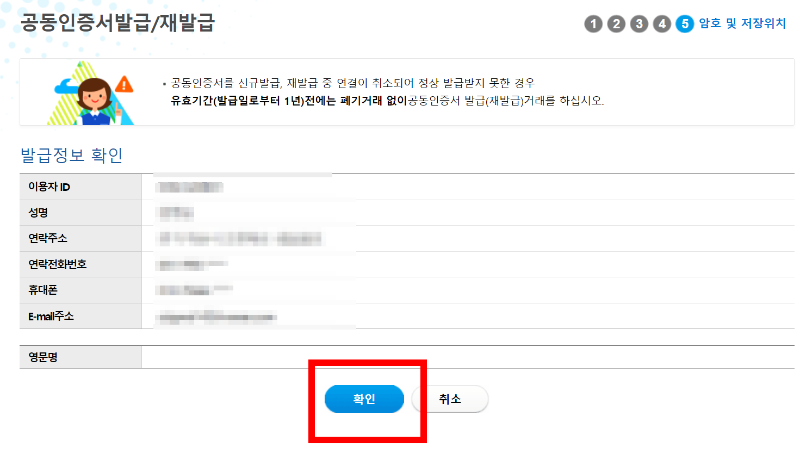 9. 발급정보를 최종 확인 후 하단의 확인을 선택합니다.