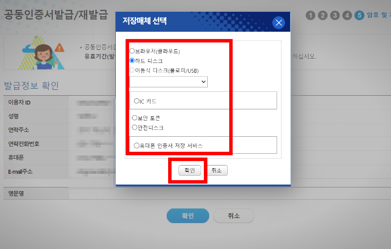 10. 공동인증서를 컴퓨터에 하드 디스크에 저장할 것인지 아님 이동식 디스크에 저장할 것인지 선택 후 확인을 선택한 다음, 공동인증서에 사용할 비밀번호 입력 후 다운로드하시면 됩니다.