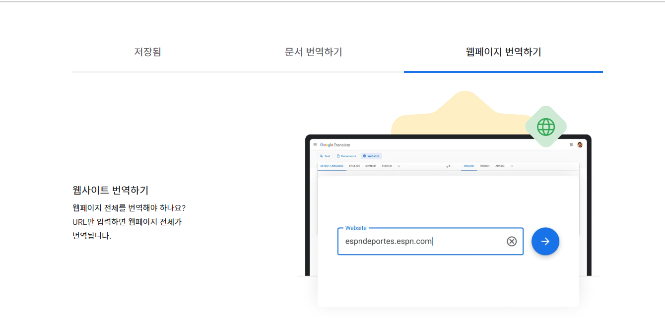 - 웹사이트 번역: 번역할 웹사이트 URL을 입력하면 해당 웹사이트가 번역된 상태로 표시됩니다.