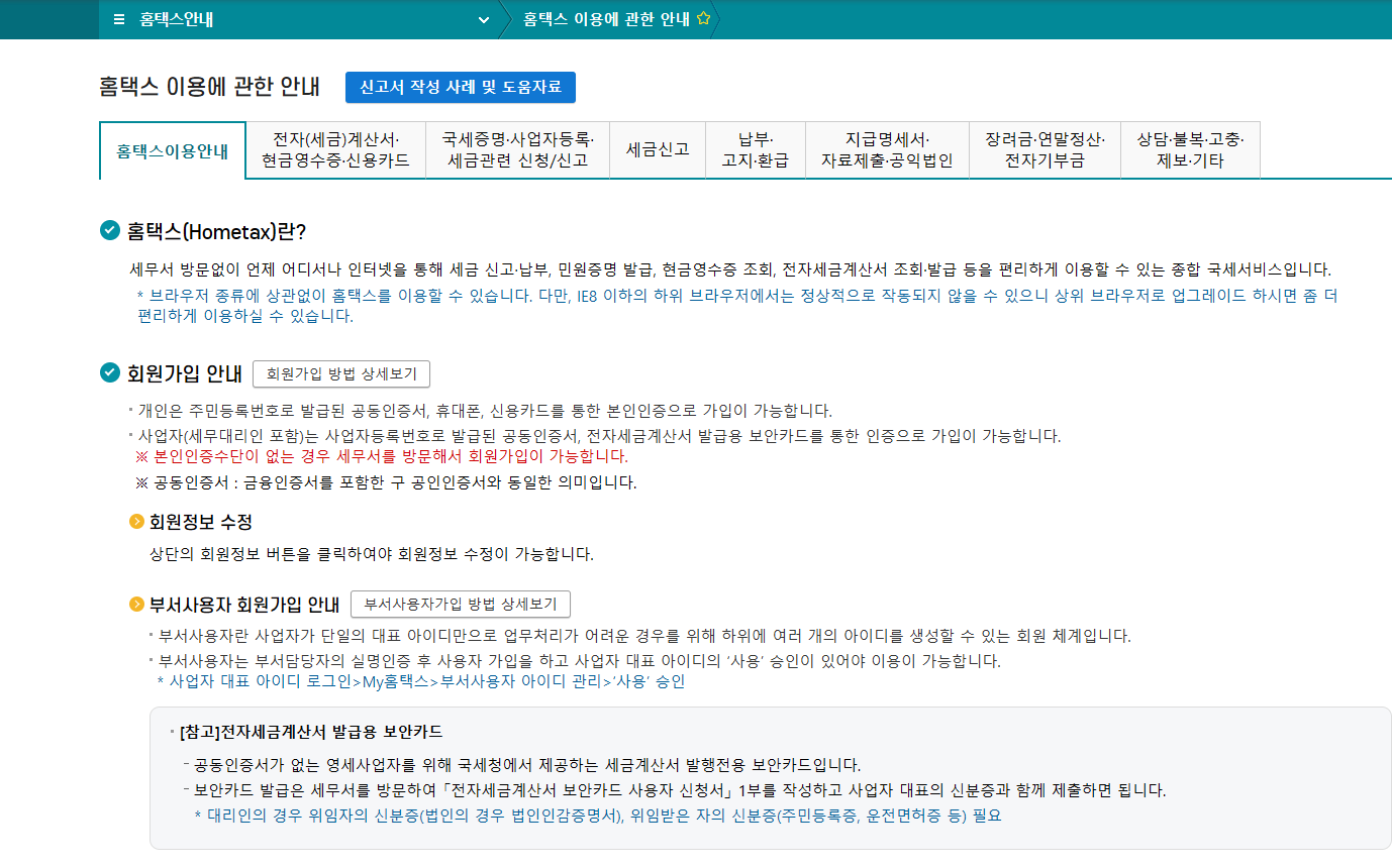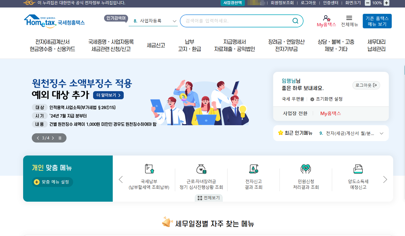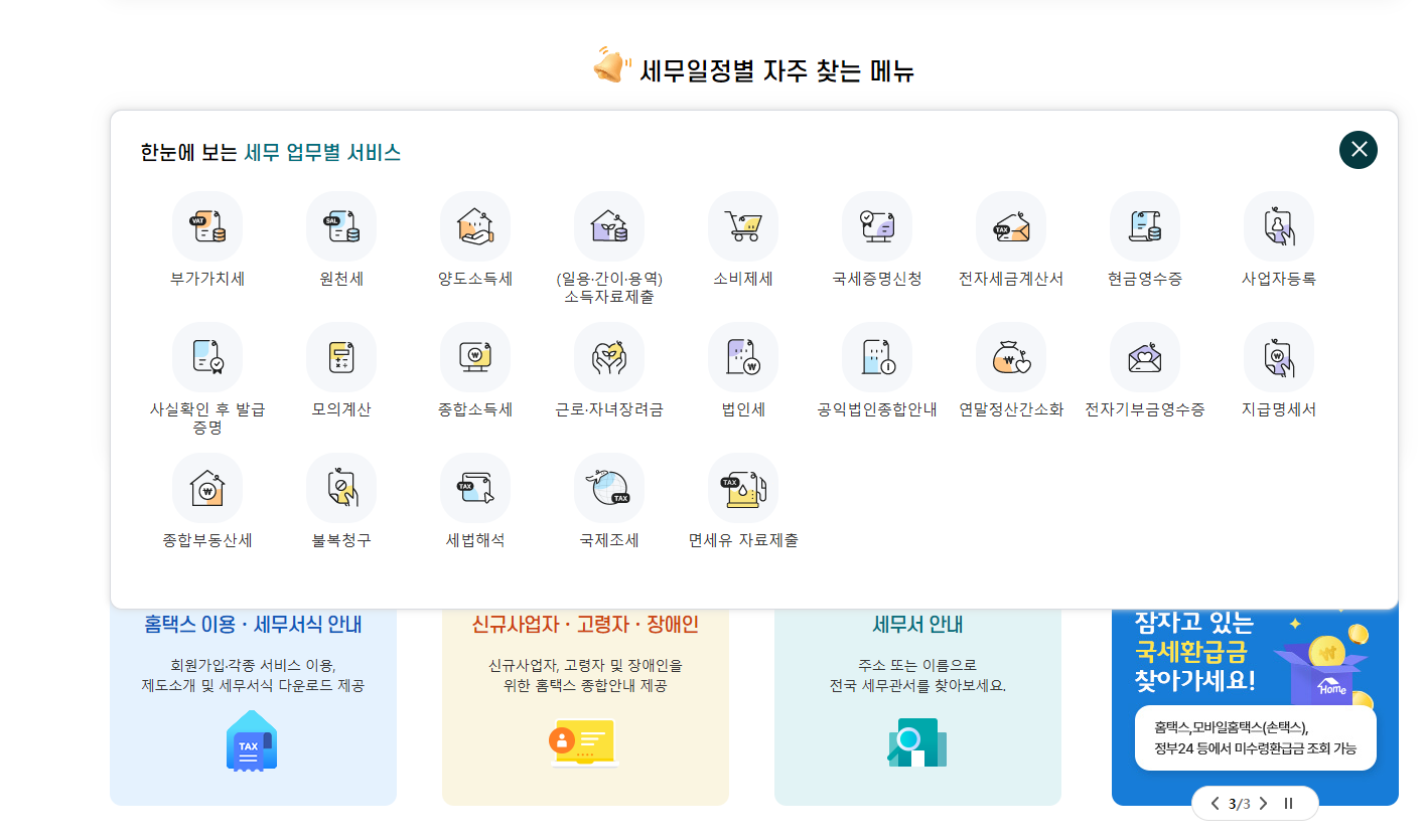 1. 국세청 홈택스 사이트에 들어갑니다. 국세증명, 사업자등록 세금관련 신청/신고를 선택합니다.