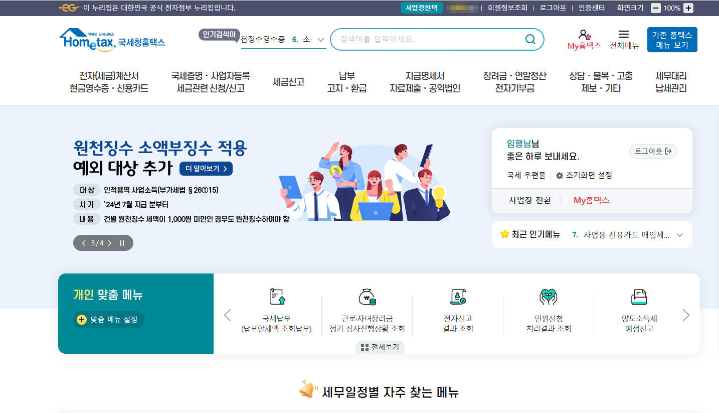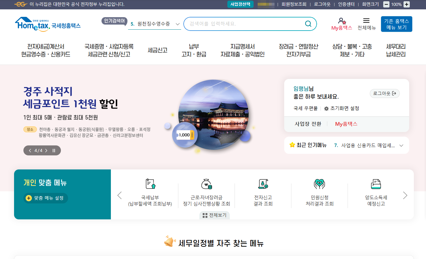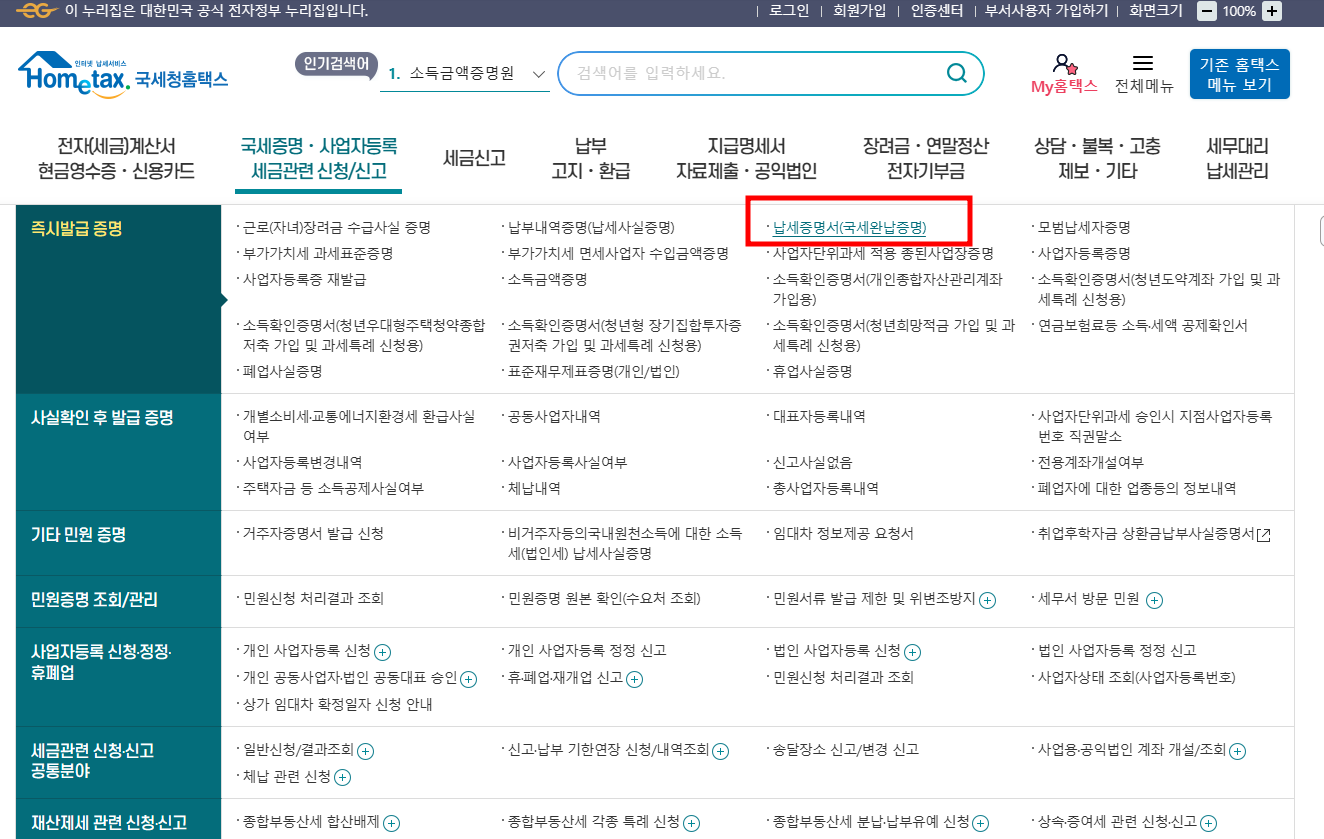 국세청 홈택스에서 발급되는 납세증명서는 국세완납증명서로 지방세 납세증명서와 다릅니다.