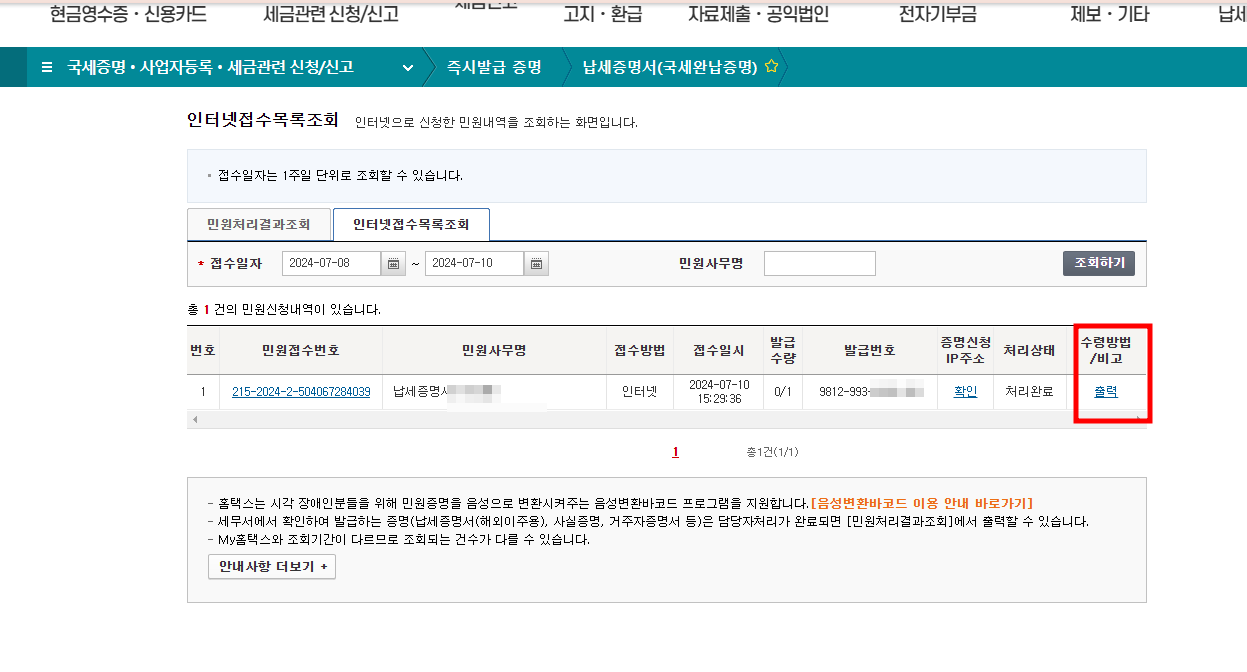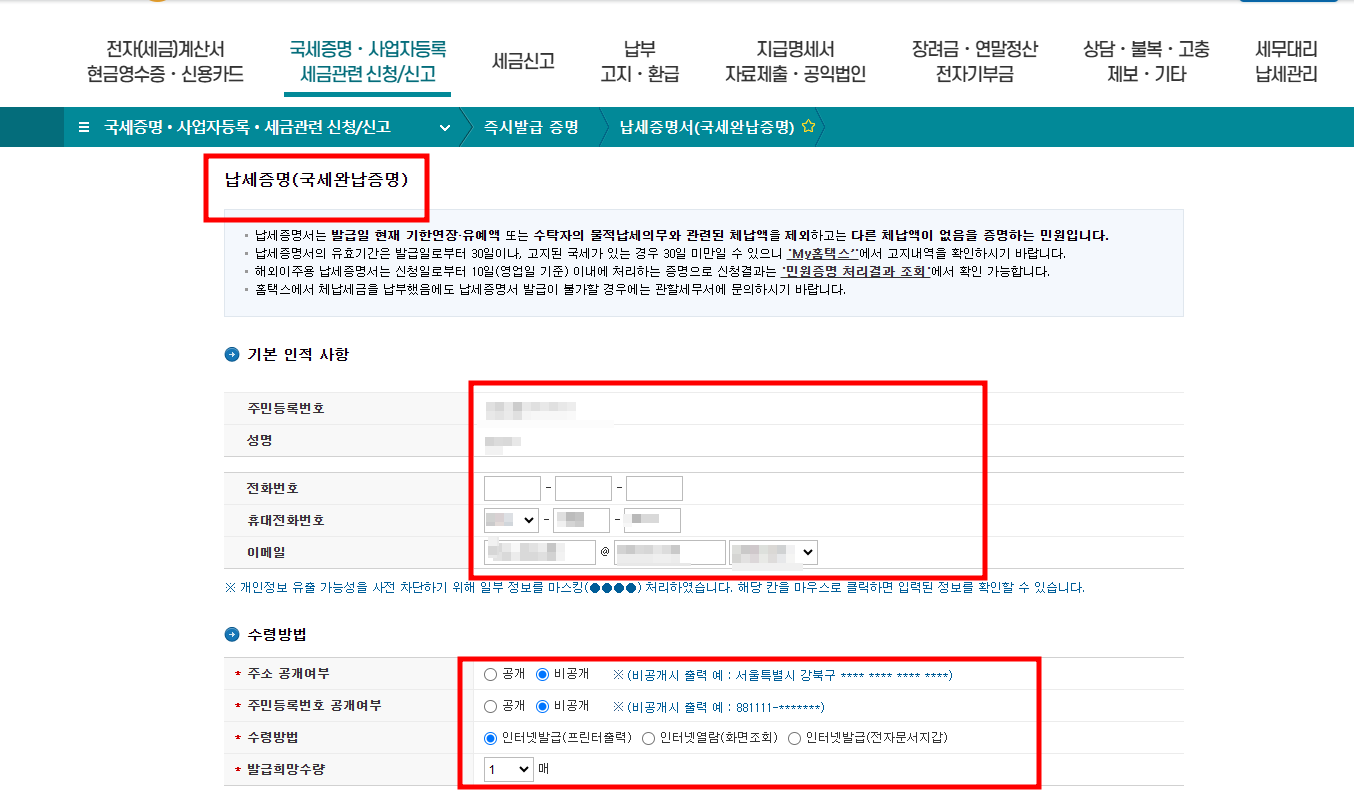 4. 민원 신청항목이 납세증명(국세완납증명)임을 확인하고, 기본 인적사항 확인하고 수령방법을 선택합니다.