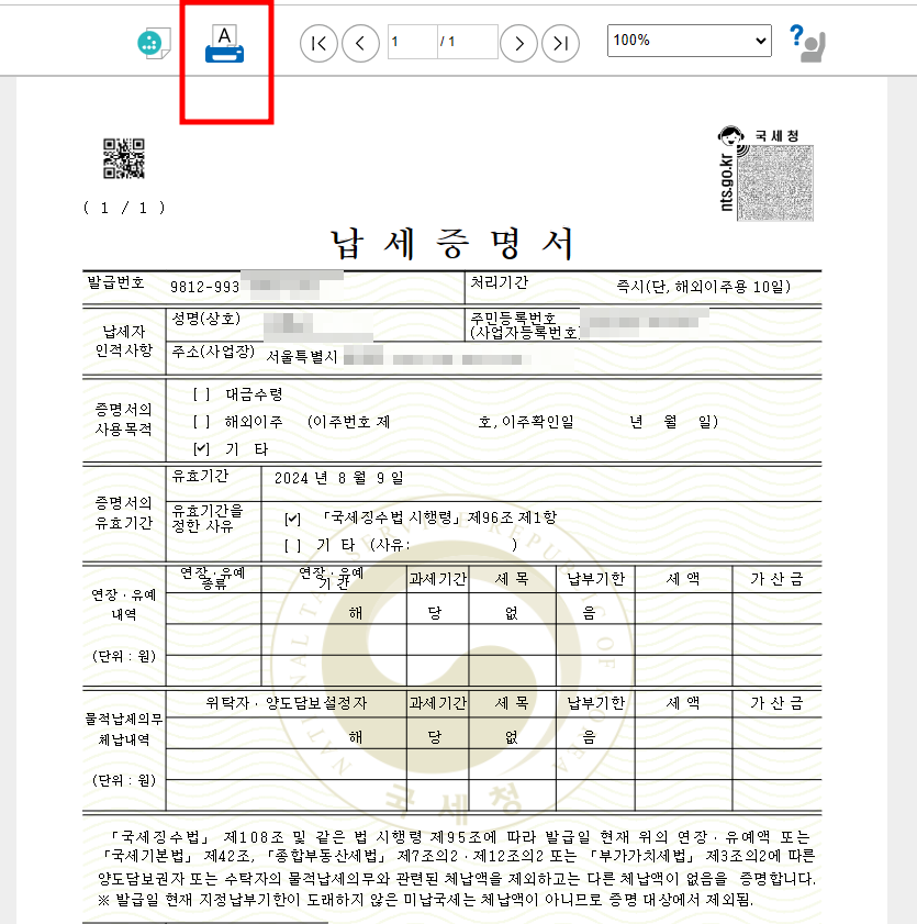 10. 새창으로 나오는 납세증명서의 내용을 확인하고 파란색 프린터 표시를 선택하여 출력을 진행합니다.