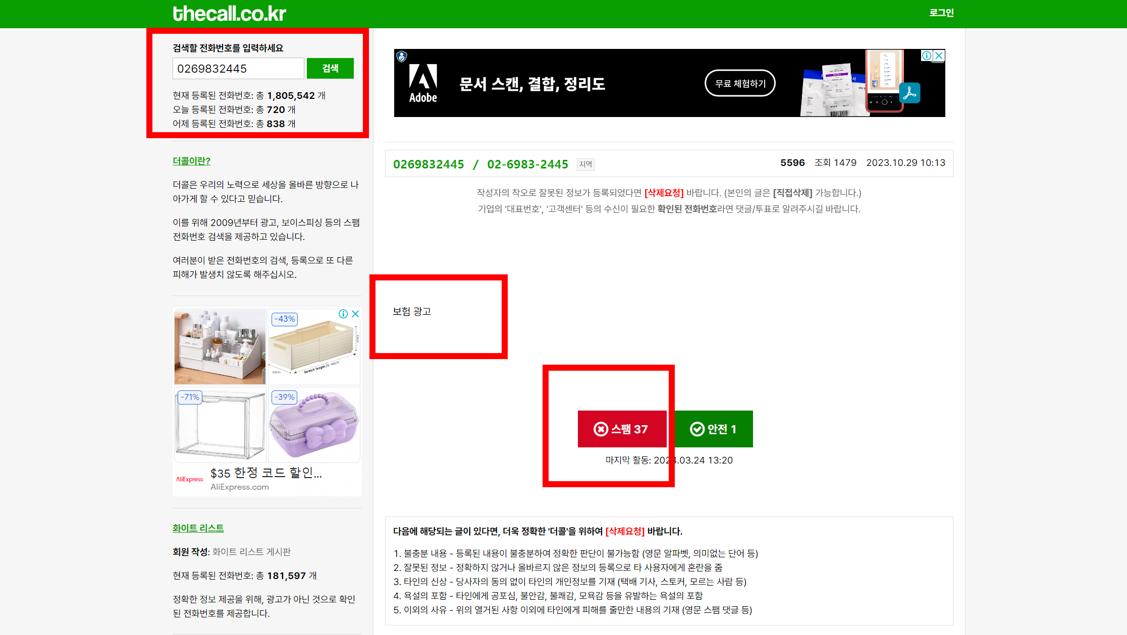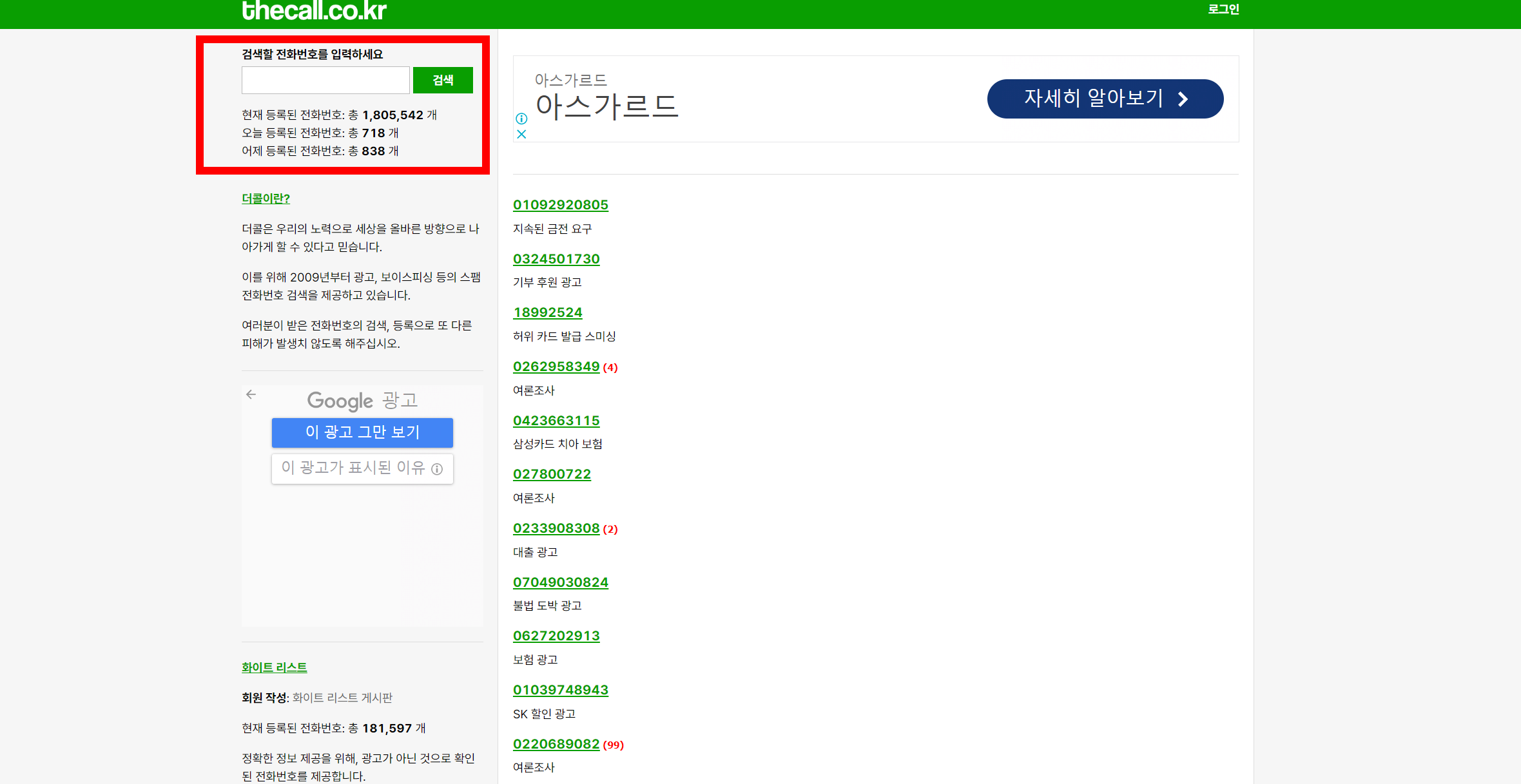 후후, 뭐야이번호와 같이 더콜도 스팸번호인지 아닌지 검색할 수 있는 사이트입니다. 2009년도부터 광고, 보이스피싱 등의 번호를 검색할 수 있도록 제공되었고, 현재 등록된 번호만 해도 총 1,805,542 개나 됩니다.