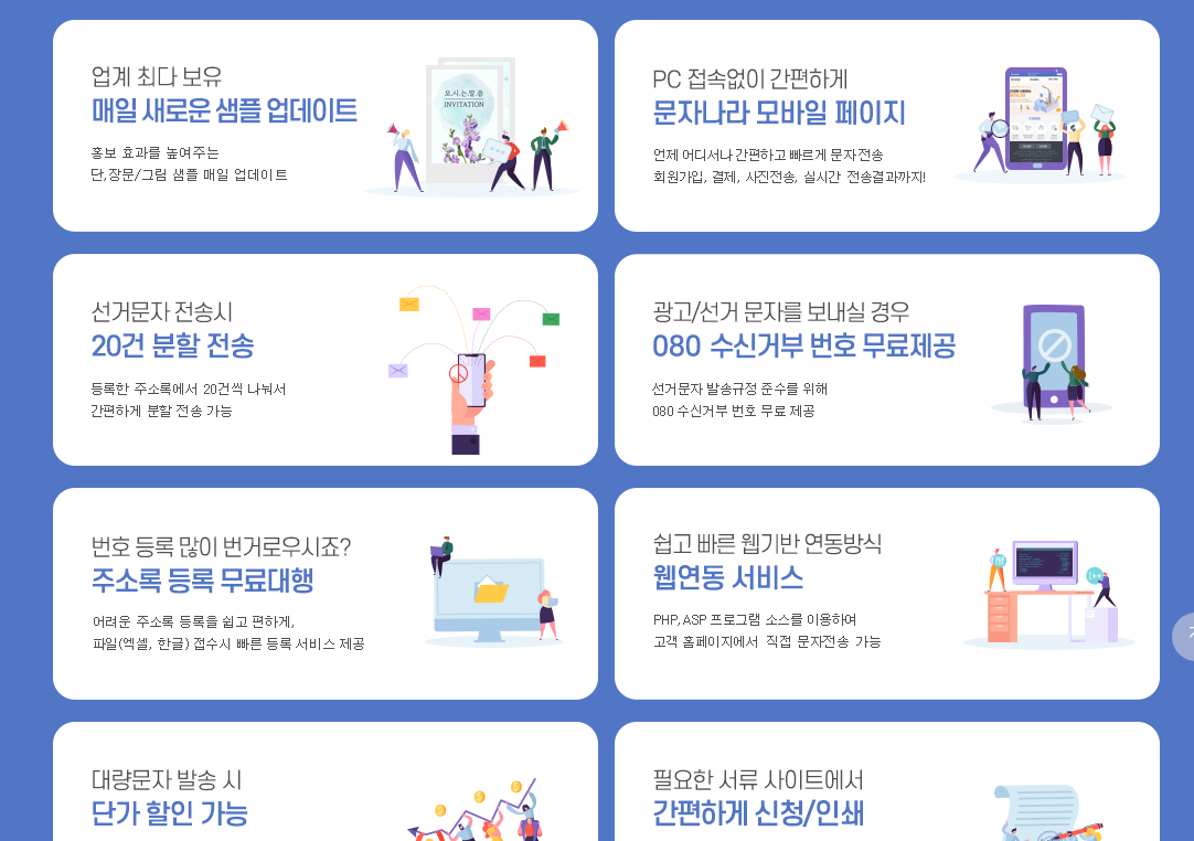 현대 사회에서 문자(SMS)는 여전히 빠르고 정확한 커뮤니케이션 수단으로 활용됩니다. 특히 기업 마케팅, 단체 안내, 고객 알림 등에서는 대량 문자 발송이 필요한 경우가 많습니다. 이러한 니즈를 충족시켜주는 대표적인 서비스가 바로 '문자나라'입니다. 간단한 회원가입만으로 수신자 수 제한 없이 문자 발송이 가능하며, 가격도 저렴하여 중소기업, 학원, 병원, 교회 등 다양한 분야에서 널리 이용되고 있습니다.
