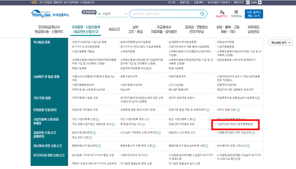첫째로, 국세청 홈택스에서 조회하는 방법입니다. 국세청에 등록되어 있는 사업자등록번호를 기반으로 하기에 가장 정확합니다.