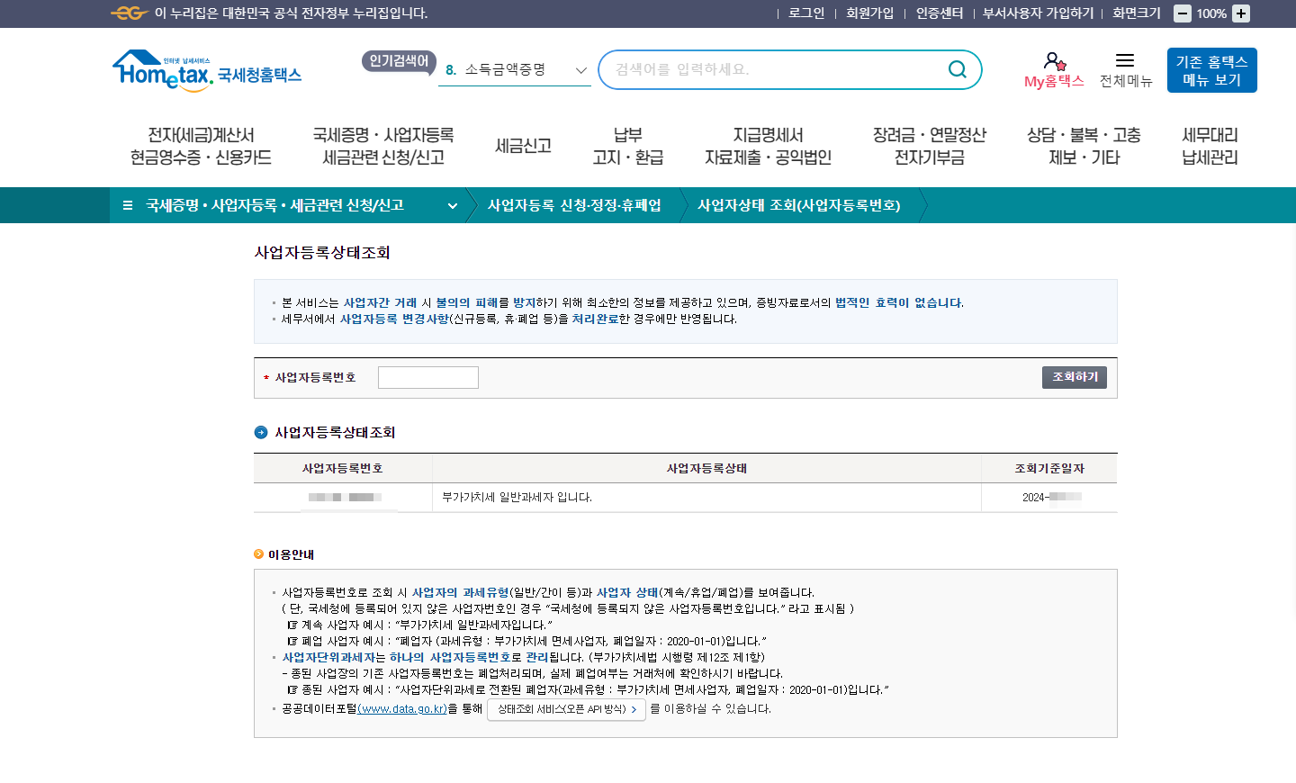 사업자등록번호 입력시, 현재 기준으로 사업을 영위하고 있는지 일반과세자인지, 면세사업자인지 조회할 수 있습니다.