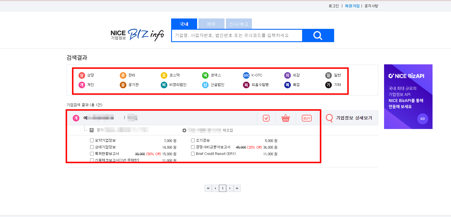 비즈노 사이트의 경우, 사업자등록번호 및 상호로도 검색이 가능합니다.