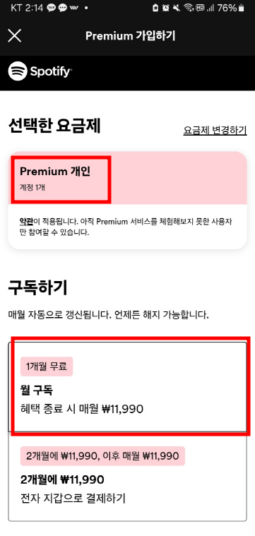 모바일에서 7개월 무료 체험을 이용 후에, 개인 요금제를 가입하면 1개월 무료로 이용할 수 있습니다. 2개월 차부터는 월 요금이 청구되며 개인 요금제만 가능합니다.