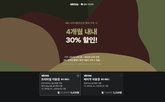 할인의 경우 IBK 나라사랑 카드로 구독 시 4개월 동안 30% 할인된다고 합니다. 적용기간은 24년 1월 1일~24년 12월 31일까지입니다.