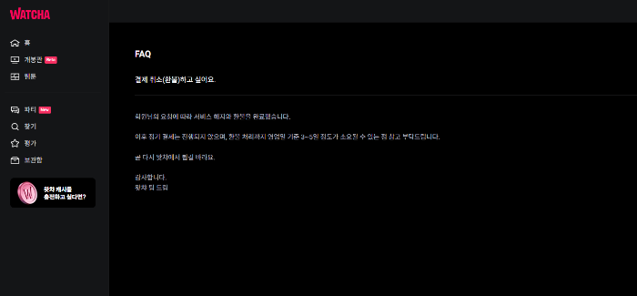 왓챠 요금 지불 후 한번도 시청 내역이 없으신 분들은 꼭 환불하기를 이용하여 소중한 돈을 환불받으시기 바랍니다.