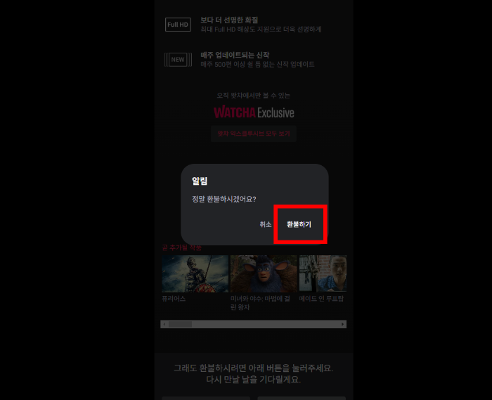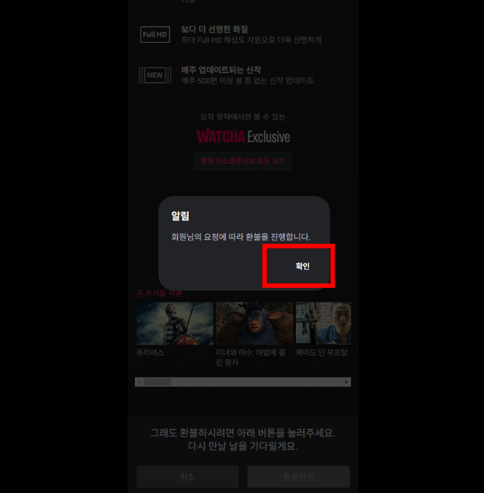 13. 한번 더 왓챠에서 팝업 창이 뜹니다. 한 번 더 확인하기를 선택합니다;;;