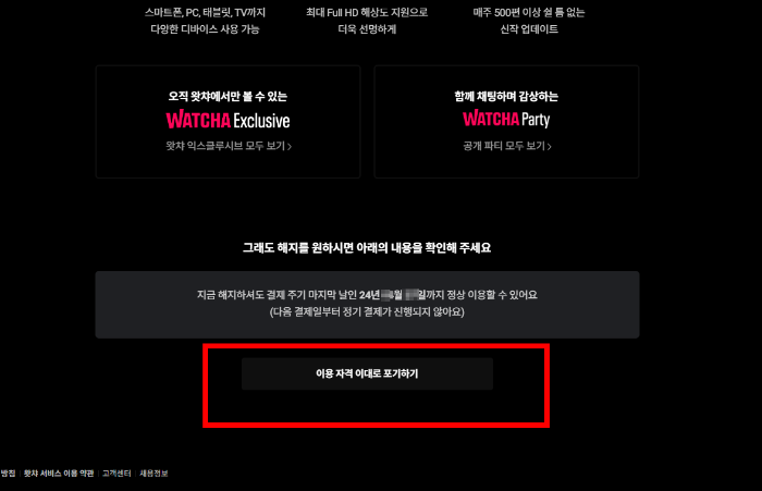 5. 왓챠는 해지까지의 방어 페이지가 많은 편입니다. 해지하려면 끝까지 스크롤을 아래로 내립니다.