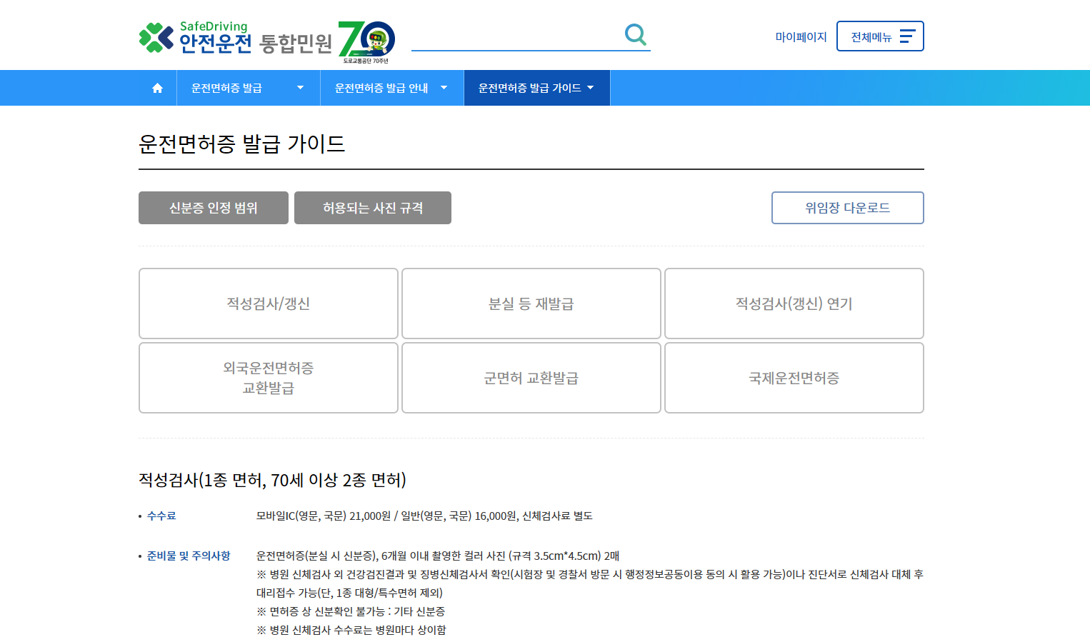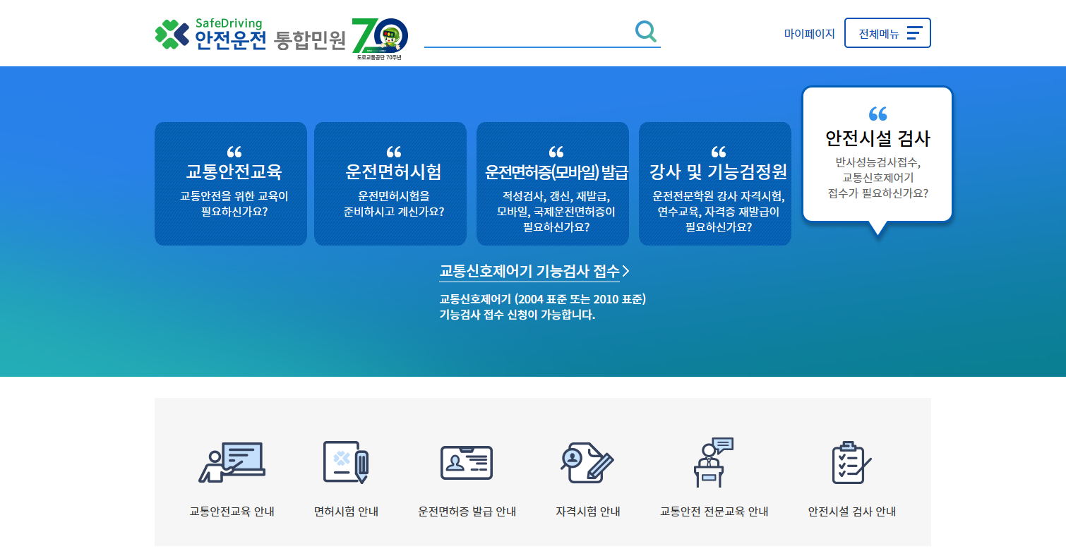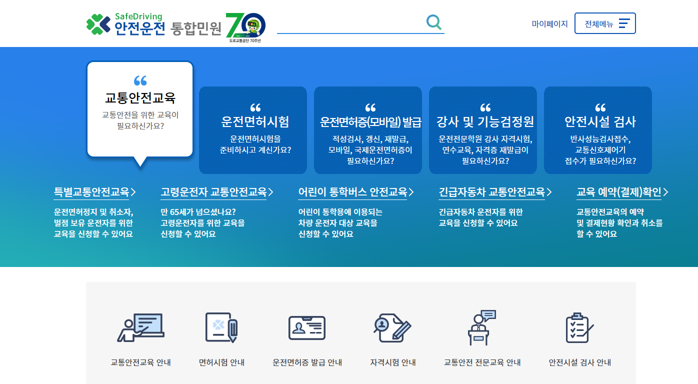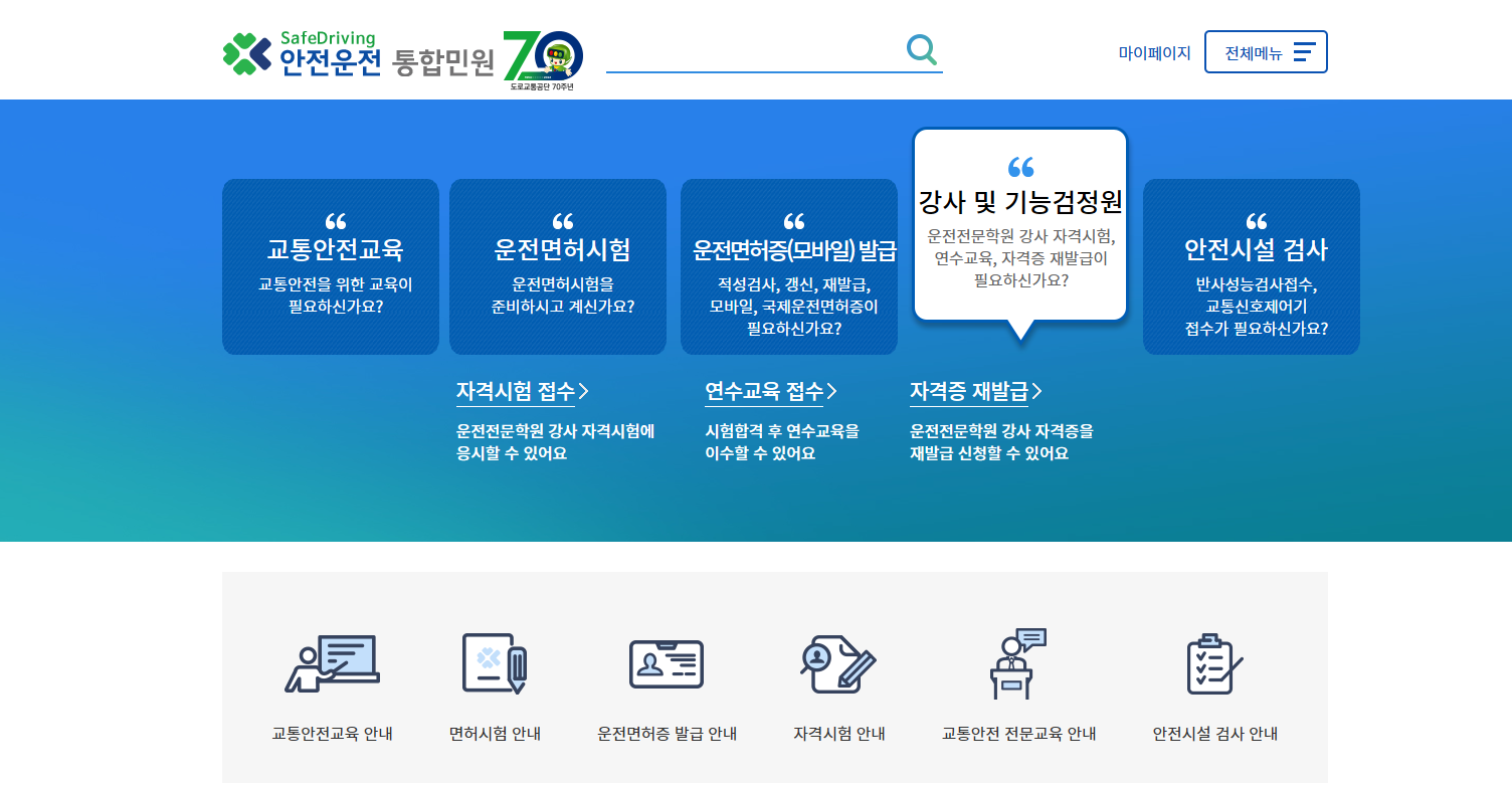 안전운전 통합민원에서는 면허증 갱신, 재발급, 국제운전면허증, 모바일 운전면허증 관련해서 필요한 사항을 신청할 수 있습니다.