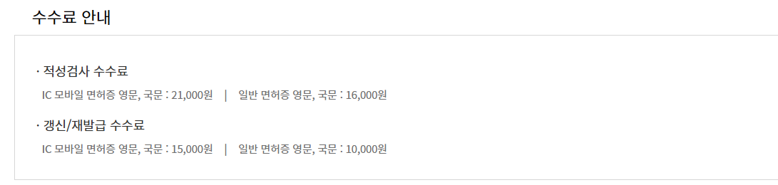 갱신/재발급 수수료의 경우 일반 면허증은 영문, 국문 상관없이 \ 10,000원, 모바일 면허증은 \15,000입니다.