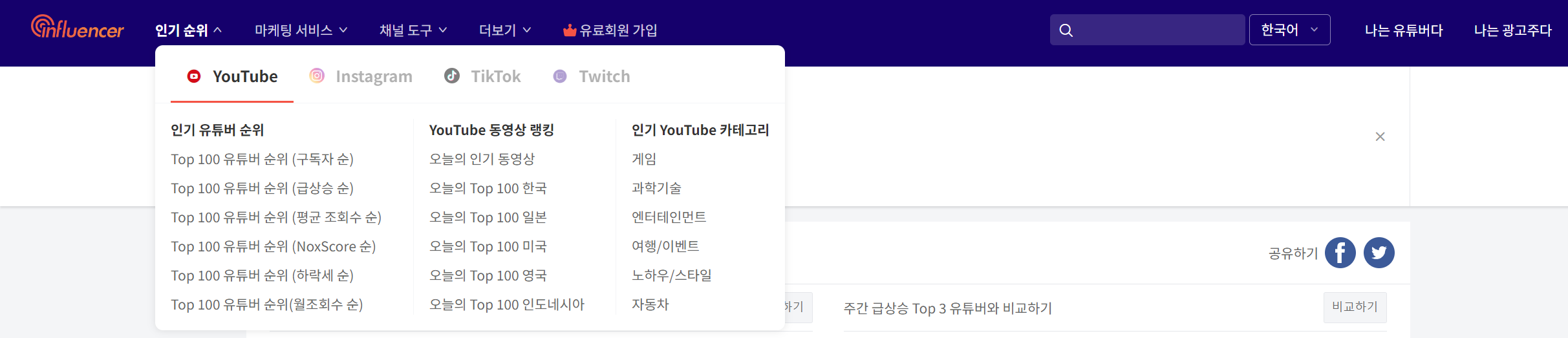 현재 Top 100 유투버 순위 (구독자순, 급상승 순, 평균 조회수 순 등)를 알 수 있습니다.