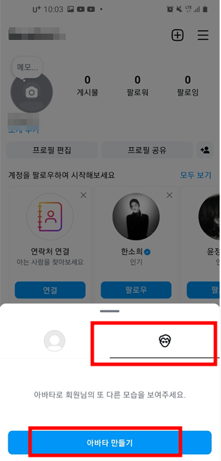 또 옆의 얼굴 모양을 선택하면 아바타를 만들 수도 있습니다.
