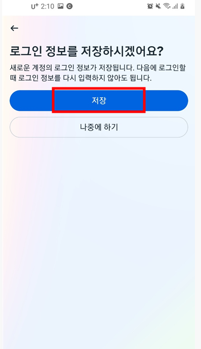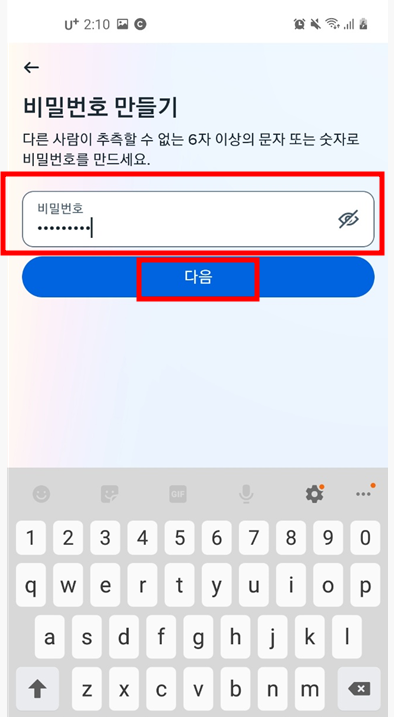 6자리 이상의 사용할 비밀번호를 입력 후에 다음을 선택합니다. 입력 후 핸드폰에서 편리하게 로그인 할 수 있도록 로그인 정보 저장을 선택합니다. (나중에 하기 선택해도 이후에 비밀번호 입력 후 로그인 하시면 됩니다.)