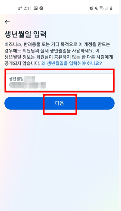 본인의 생년월일을 입력하고 다음을 선택 후, 인스타그램에 사용할 닉네임을 입력합니다. 입력 후 다음을 선택합니다.