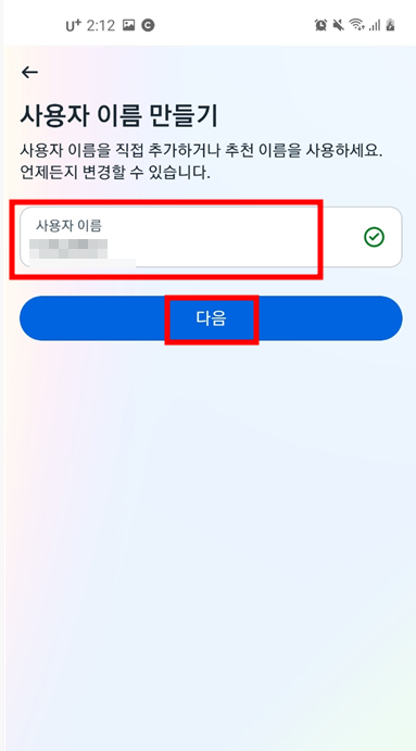 사용자 이름 최종 확인 후, 다음을 선택합니다. (사용자 이름을 초기에 잘못 설정하였다 하더라도 후에 변경 가능합니다.)