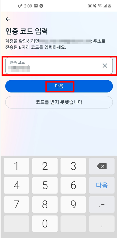 이메일 주소 입력하여 계정 만들때에, 이메일로 인증코드가 발송됩니다. 메일을 확인하여 인증코드를 입력 후에 다음을 선택합니다.