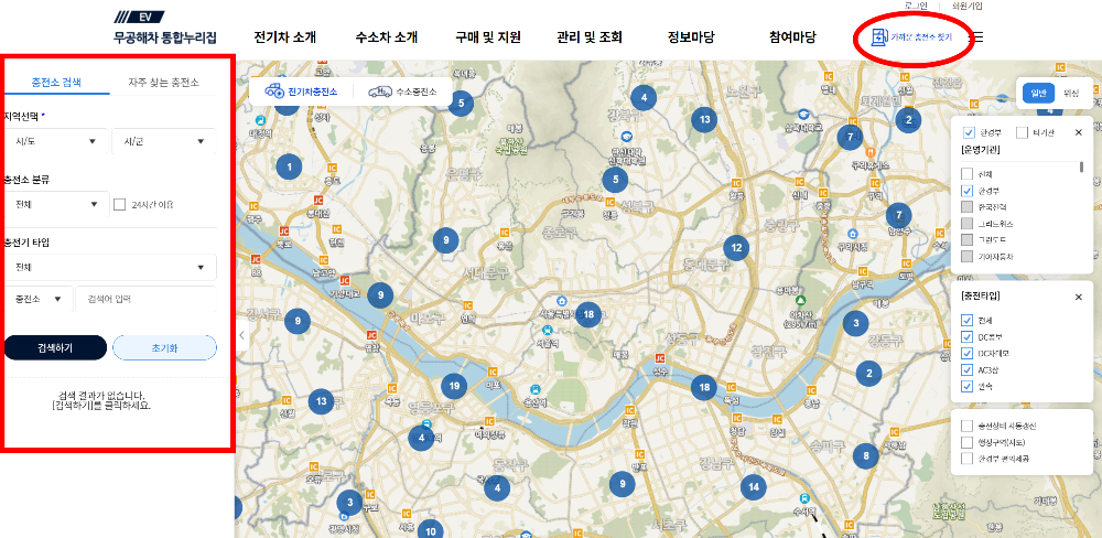 무공해차 통합누리집 → 가까운 충전소 조회하기를 클릭하면 지역, 충전소 분류, 충전기 타입에 따라 가능한 충전소 위치를 조회할 수 있습니다.