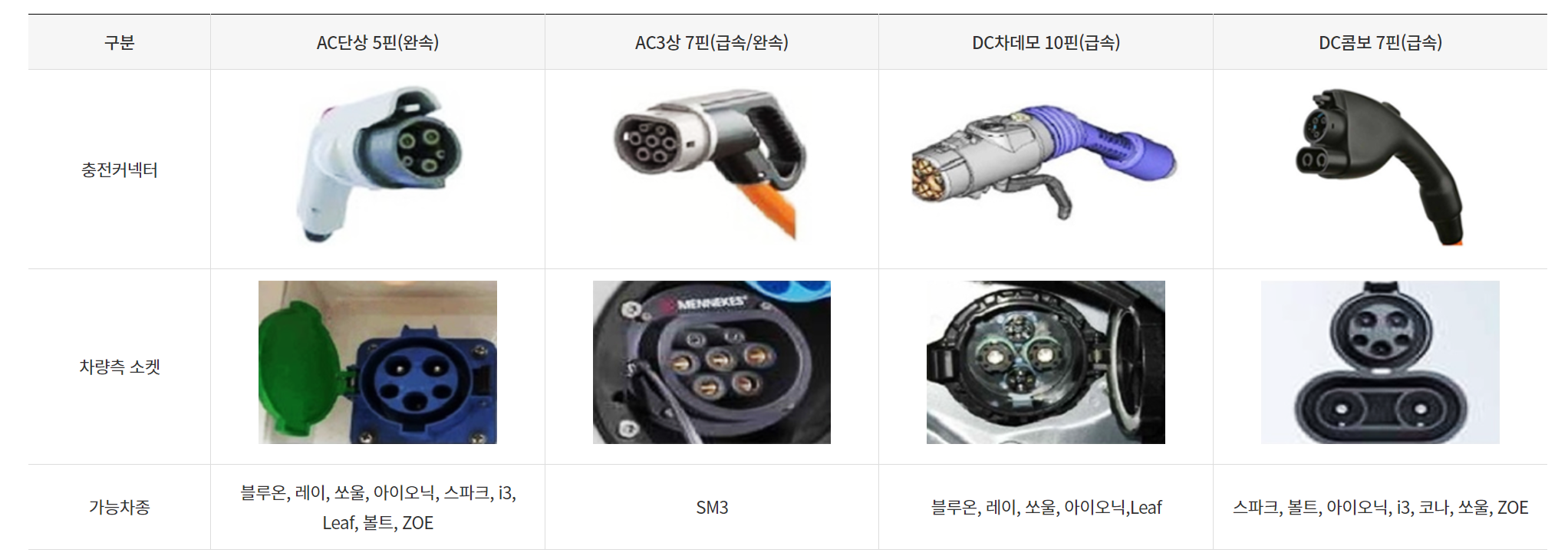 전기차 차량 종류에 따라 충전커넥터와 소켓이 다르며, 완속과 급속도 서로 다릅니다. 완속과 급속 충전 시간이 많이 차이 나니 충전가능한 커넥터와 소켓을 잘 확인해 보시면 좋을 것 같습니다.