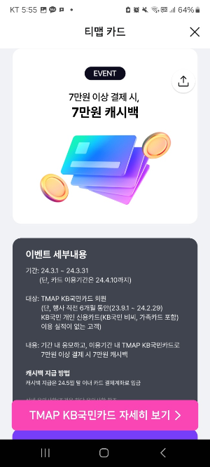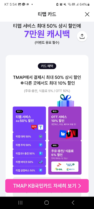 혹시 KB카드 아직 발급받지 않으신 분들은, 최초 TMAP KB 카드 발급 시 티맵 서비스 50% 상시할인된다고 하니 행사 내용을 참고해 보세요.