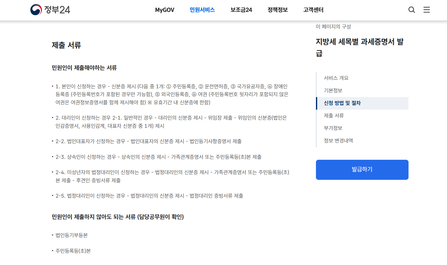 지방세 세목별 과세증명이란, 지방세 과세 및 납부실적을 증명하는 민원으로 해당연도에 납부한 자동차세, 등록세, 면허세, 재산세 등 납부한 금액이 표기된 증명서로 받을 수 있는 문서입니다. 주로 공공기관 입찰이나 대출 신청 시 등에 사용됩니다.