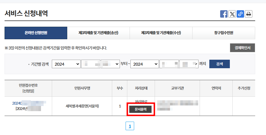 9. 서비스 신청내역을 확인하고 문서출력 버튼을 선택합니다.