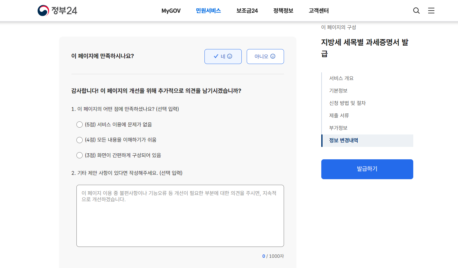 질문 1) 지방세 세목별 과세증명서 수수료는 얼마인가요?