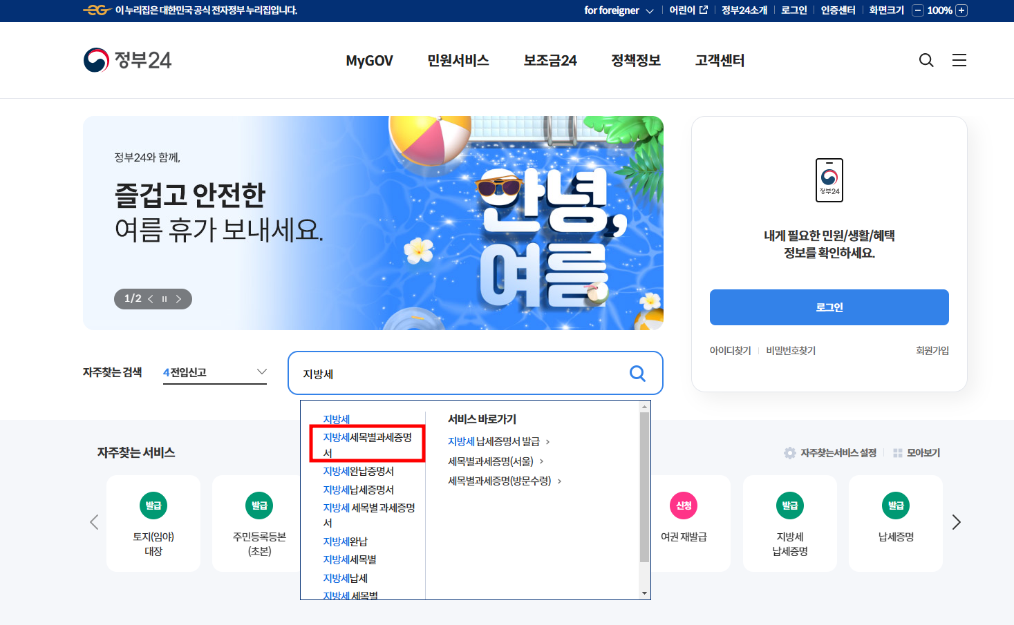 1. 정부24에 들어갑니다. 검색창에서 지방세 세목별 과세증명서를 검색합니다.
