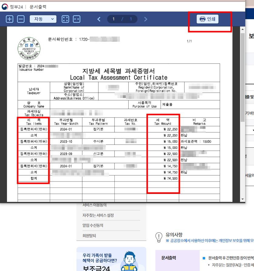 납부한 지방세의 종류와 함께 금액이 기재되는 것을 확인할 수 있습니다.