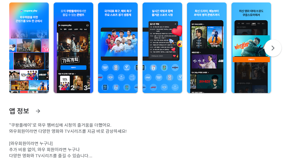 지금 쿠팡플레이 앱을 설치해두세요. 무료 서비스는 6월부터 시작되며, 서비스 개시와 함께 다양한 이벤트도 예정되어 있다고 합니다. 게다가 와우회원이라면 더 높은 화질(4K), 멀티채널 오디오, 리워드 혜택도 누릴 수 있으니 활용도는 더욱 커집니다.